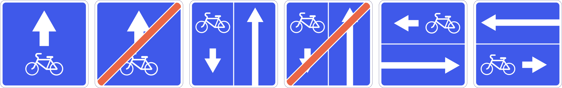 - «Дорога с полосой для велосипедистов». Обозначает начало дороги, по которой движение велосипедистов и водителей мопедов осуществляется по специально выделенной полосе навстречу общему потоку транспортных средств.