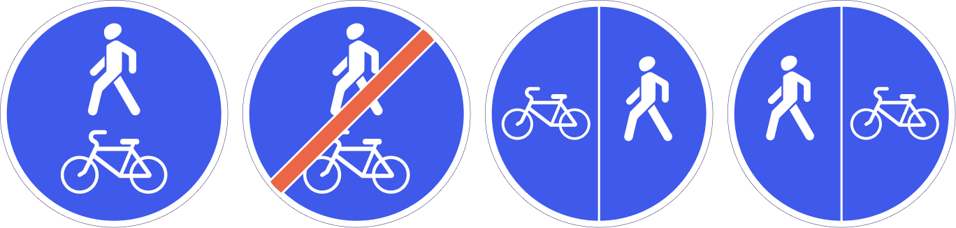 - «Конец пешеходной и велосипедной дорожки с разделением движения». Означает то, что разделенный участок дороги для пешеходов и велосипедистов заканчивается.
