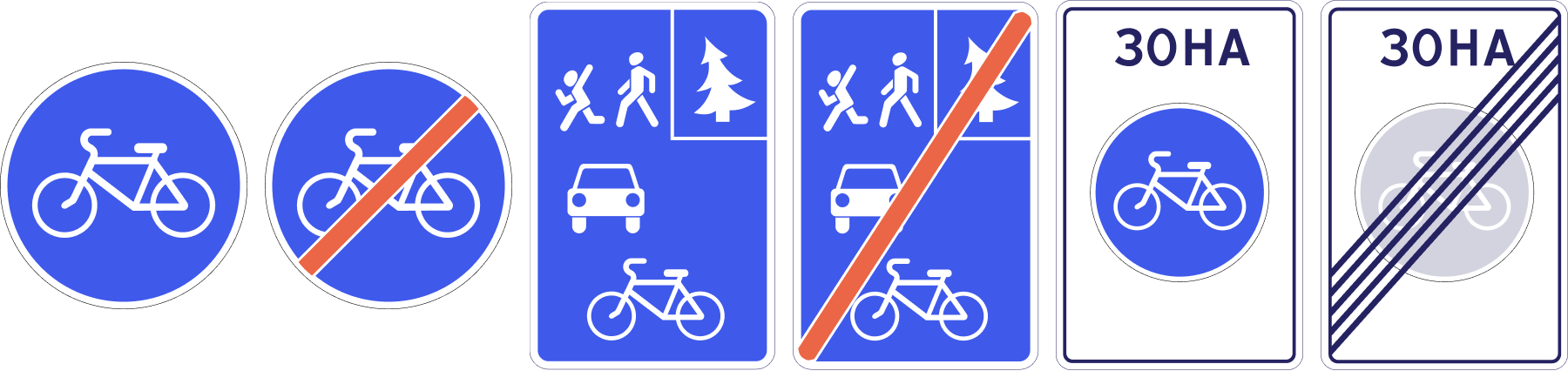Если есть выделенная дорога для велосипедов — поезжайте по ней. Таких существует четыре типа: велодорожка, велопешеходная дорожка, велополоса и велозона. Они всегда сопровождаются знаками. Вот какая разница между ними и как выглядят знаки: