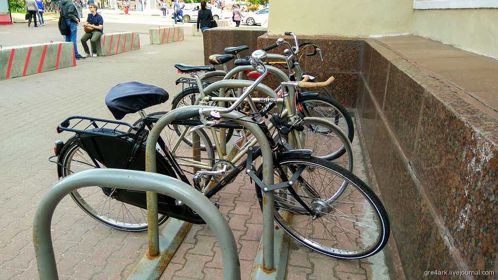 Вот возле магазина «Раздолье» на пр-кте Мира велопарковка не очень красивая, но зато высокая и с широкими секциями, туда можно полностью закатить хотя бы одно колесо и велосипед уже можно нормально пристегнуть.