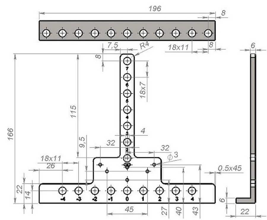 В первую очередь, необходимо отрезать от бруска сечением 10×10 мм заготовку нужной длины, которую определите самостоятельно. Заусенцы можно отшлифовать болгаркой или напильником. При помощи чертилки и кернера отметьте центры будущих отверстий. Как правило, расстояние между пазами устанавливают на 32 мм, а цифра между боковой гранью и центральной линией прорезей – 8 мм. Для разметки следует использовать не линейку, а штангенциркуль – это позволит выйти на самые точные размеры.