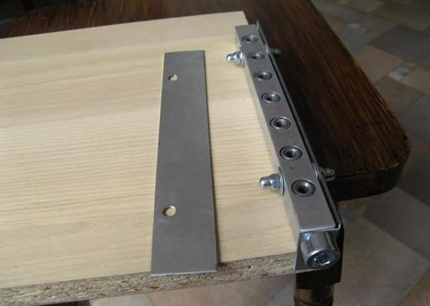 Конечно, мебельный кондуктор можно попросту купить, но сделать это не так просто. Во-первых, таких приспособлений нет в свободной продаже, а, во-вторых, если вы даже и найдете, где приобрести такой инструмент, то он обойдется не дешево, так как такие кондукторы многофункциональны и некоторыми функциями вы никогда не воспользуетесь. Все это говорит о том, что для стяжки мебели эксцентриками гораздо выгоднее и удобнее сделать такое приспособление самостоятельно. Для этого можно использовать листовой металл, пластик, цельномассивную древесину, фанеру и ОСП (OSB), но наиболее оптимальным будет первый вариант, так как на стальном прокате отверстия не будут разбиваться, следовательно, высокая точность гарантирована.