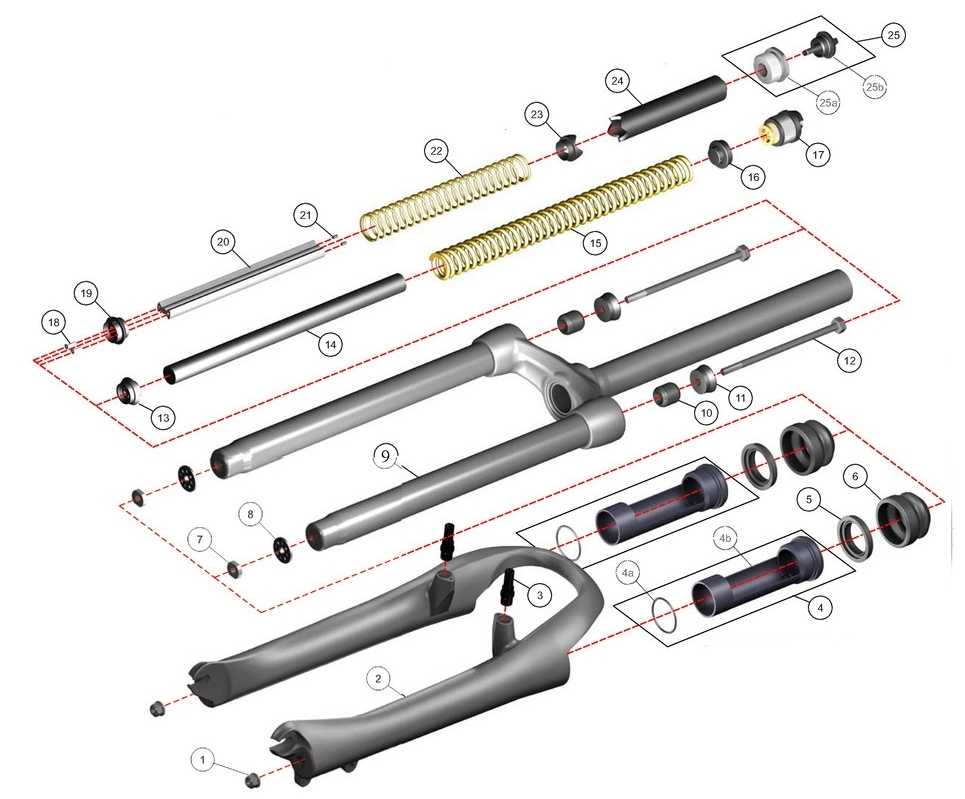 Сборку вилки осуществляем в обратной последовательности. Ниже будет приведена условная схема (на ней указаны только те элементы, которые мы снимали).