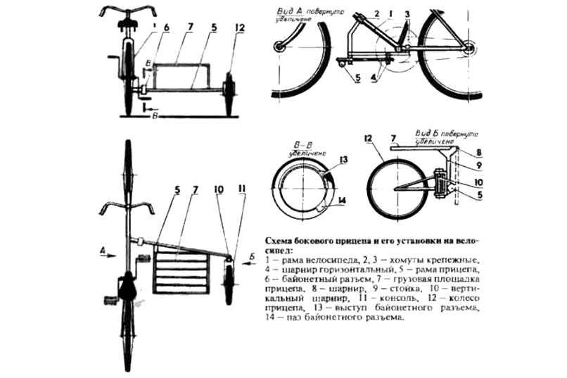 Если прицеп жестко соединить с велосипедом сбоку, то при отсутствии груза в тележке для удержания равновесия придется наклоняться вправо. Для устранения неудобства следует обеспечить подвижное соединение тележки с велосипедом.