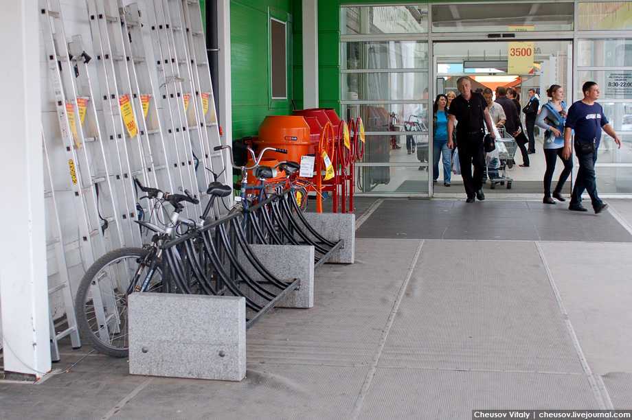Прокатившись вокруг и протестировав различные варианты исполнения, понял — удобных среди них нет. Вот, например, возле Леруа Мерлен, здорово, что под навесом и расстояние между секциями позволяет комфортно разместить велосипед, но… он будет занимать треть прохода, а людей там очень много, глядишь кто-нибудь психанет и отломает что-нибудь, да и пристегнуть опять же очень проблематично, поэтому все ставят велосипеды за парковку к стенке.