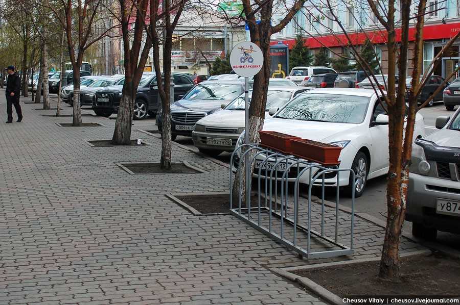 Передвижение на велосипеде становится все популярнее в Красноярске, этому не мешает даже практически полное отсутствие инфраструктуры. Самые умные бизнесмены понимают, что делая жизнь велосипедистов удобнее, они могут привлечь их к себе в качестве клиентов и заработать больше денег, поэтому возле магазинов стали появляться велопарковки, за что им большое спасибо. Однако, без «но» тут не обойтись, дело в том, что зачастую те, кто ставит эти самые парковки, сами на велосипеде не ездят и не всегда понимают как же сделать действительно удобную велопарковку. Поэтому велосипедисты с одной стороны рады, а с другой стороны огорчены тем, что поставить велосипед в установленные конструкции очень сложно, а пристегнуть еще сложнее.Вот одна из велопарковок на которую мне пожаловались, находится она возле «Командора» на Дубровинского. В ней 8 секций, но фактически поставить можно только 3-4 велосипеда