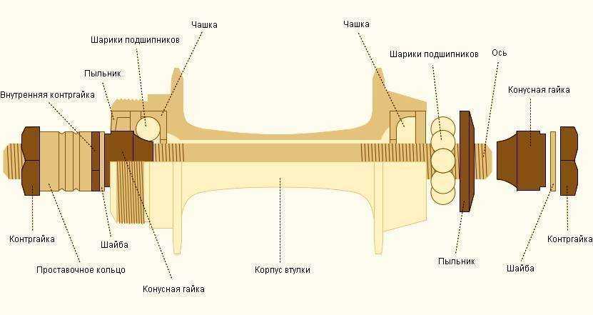 Как мы видим втулка с подшипниками типа «конус-чашка» состоит из: корпуса, оси, чашек, шариков, пыльников, конусных гаек, шайб, пыльников, контргаек (и барабана, если мы рассматриваем заднюю втулку).