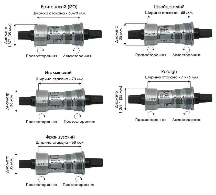 На велосипедах разных классов логично устанавливать велосипедные шатуны и каретки разных стандартов. На данный момент популярны следующие типы кареточного узла: