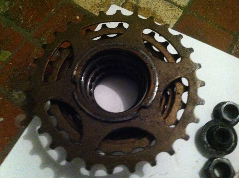 Однако некоторые люди игнорируют этот мой совет и пробуют обслуживаться трещотки следующим образом: Снимите с велосипеда колесо с трещоткой. Вы должны видеть кольцо с двумя отверстиями для штифтового гаечного ключа, чтобы вставить его. Это — обычно кольцо, на котором имеется фирменный знак и, может также быть стрелка, указывающая направление по часовой стрелке, и слово «remove» на одном или другом языке. Если вы не видите такое кольцо, возможно необходимо снять самую маленькую звездочку, чтобы получить доступ к нему. Вам будут необходимы два ключа: один, чтобы отвинтить самую маленькую звездочку, другой, чтобы зажать трещотку так, чтобы она не вращалось назад, в то время как вы отвинчиваете верхнюю звездочку. Используйте небольшой молоточек и легкое зубило (или отвертку с плоским жалом), чтобы скрутить кольцо по часовой стрелке. Это кольцо — фактически конус подшипника с левой резьбой, и если только вы удалили его, вы будете видеть ряд 1/8″ шариков подшипника и набор очень тонких шайб.