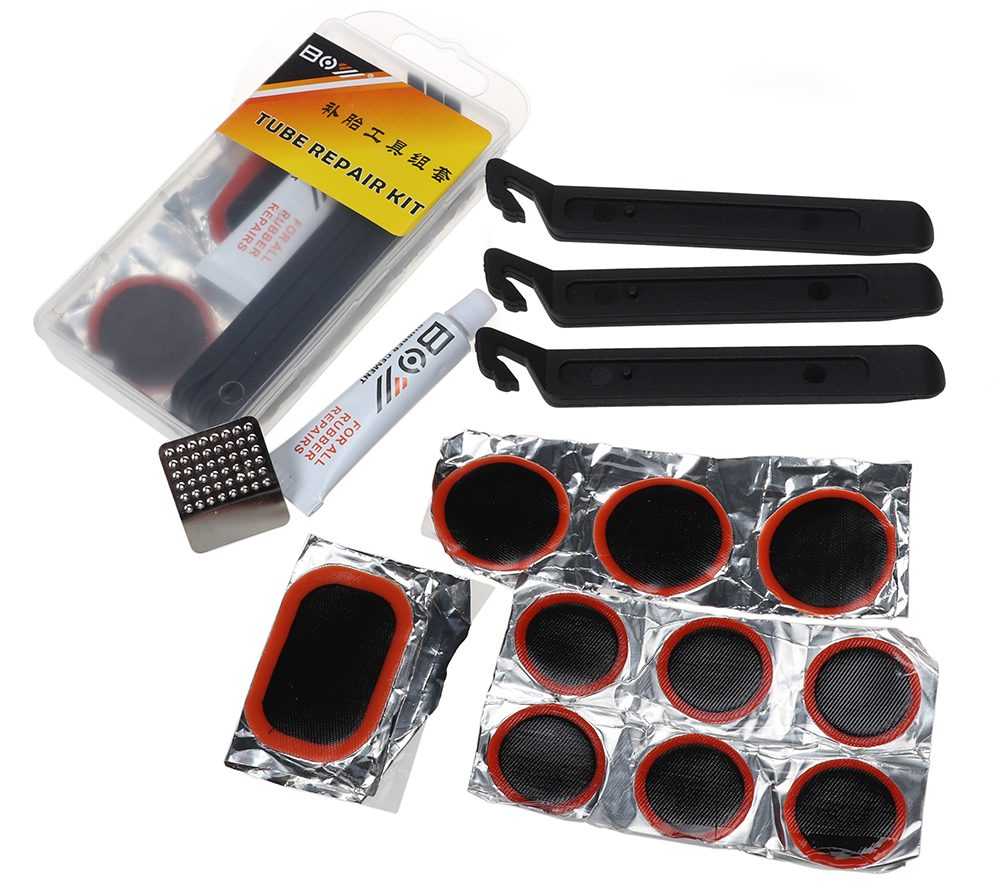 Чтобы не иметь неприятностей со случайными проколами, такой ремонтный комплект рекомендуется возить с собой. Он представлен клеем и несколькими десятками латок в виде прямоугольных резиновых кусочков, защищенных фольгой со стороны, обработанной клеем.
