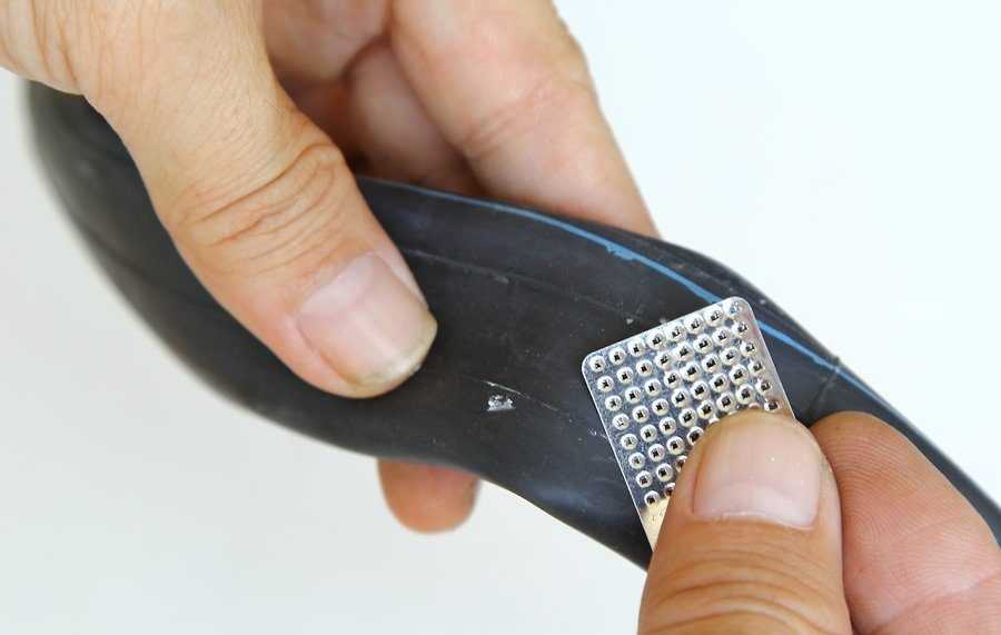 - В качестве заплатки можно использовать кусочек другой старой камеры, а лучше купить специальные эластичные заплатки, которые есть в любом магазине. В идеальном случае заплатка должна быть более эластичная и тонкая, чем сама камера. Если заплатка не подготовлена специальным образом, то её также необходимо зачистить шкуркой и обезжирить ацетоном.