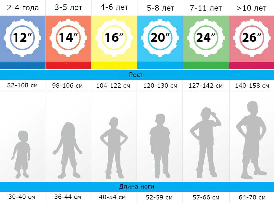 | Возраст | Рост (см) | Диаметр колеса (дюйм) | Тип тормоза | Количество скоростей |
