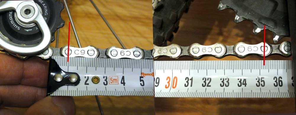 На новой цепи длина одного звена (расстояние между осями пинов) – полдюйма (12,7 мм). Соответственно берём, например, 27 звеньев (чем больше, тем точнее будет результат) и измеряем расстояние между осями пинов на натянутой цепи. На новой цепи это расстояние 342,9 мм (27х12,7).