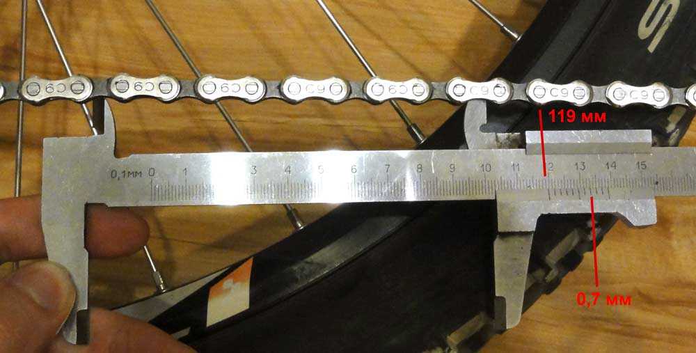 Возьмём 10 звеньев: 12,7х10 = 127 мм. Минус расстояние от губок до осей пинов. Но даже у новых цепей это расстояние может немного отличаться в зависимости от модели или производителя из-за разной толщины роликов. Поэтому результат измерений для новой цепи обычно составляет 119,3-119,7 мм. Если вы планируете проверять износ штангенциркулем, то после установки лучше сразу же измерить новую цепь (эталонный замер) и посчитать допуск. Либо можно взять среднее значение – 119,5 мм.