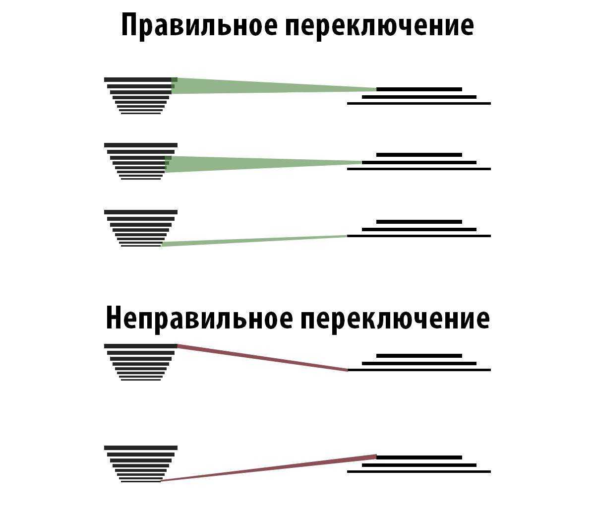 Переходить с одной передачи на другую нужно немного заранее, и делается это так:
