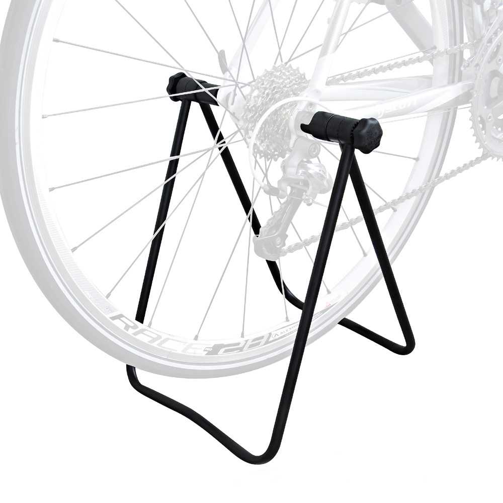 Такая подставка хорошо подходит для хранения велосипеда на балконе, в гараже или в квартире. Раскладная конструкция позволяет легко перемещать подставку, а в случаях, когда в ее использовании нет необходимости, она занимает мало места. Большинство конструкций раскладных подставок рассчитаны на заднее колесо, которое помещается в конструкцию.