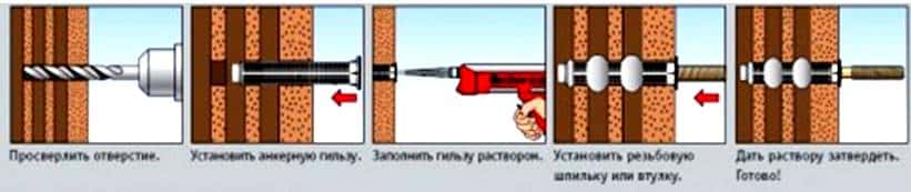 Надежно закрепить подвес на стене из материалов с мелкими пустотами можно с использованием химического анкера. Технология заключается в том, что после сверления отверстия оно заполняется специальным составом, в который вставляется шпилька.