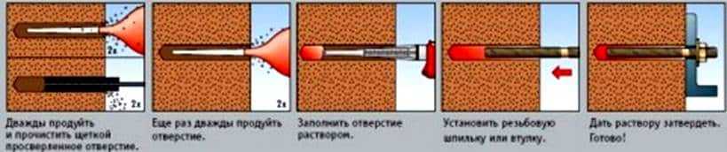 Смесь застывает достаточно быстро (конкретное время указано на упаковке), и крепление можно нагружать. Схема действий поэтапно представлена следующей иллюстрацией.