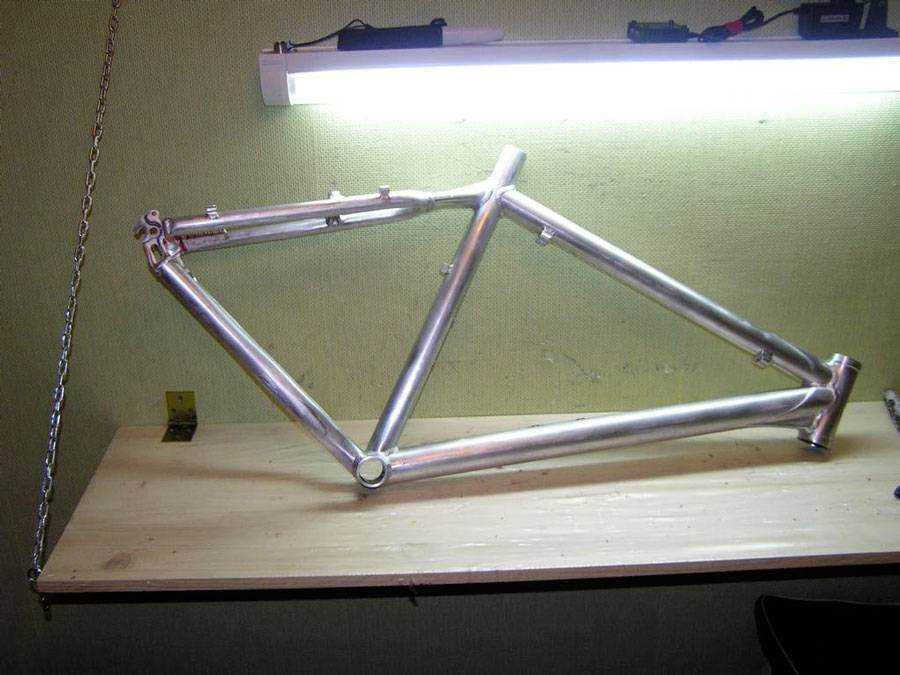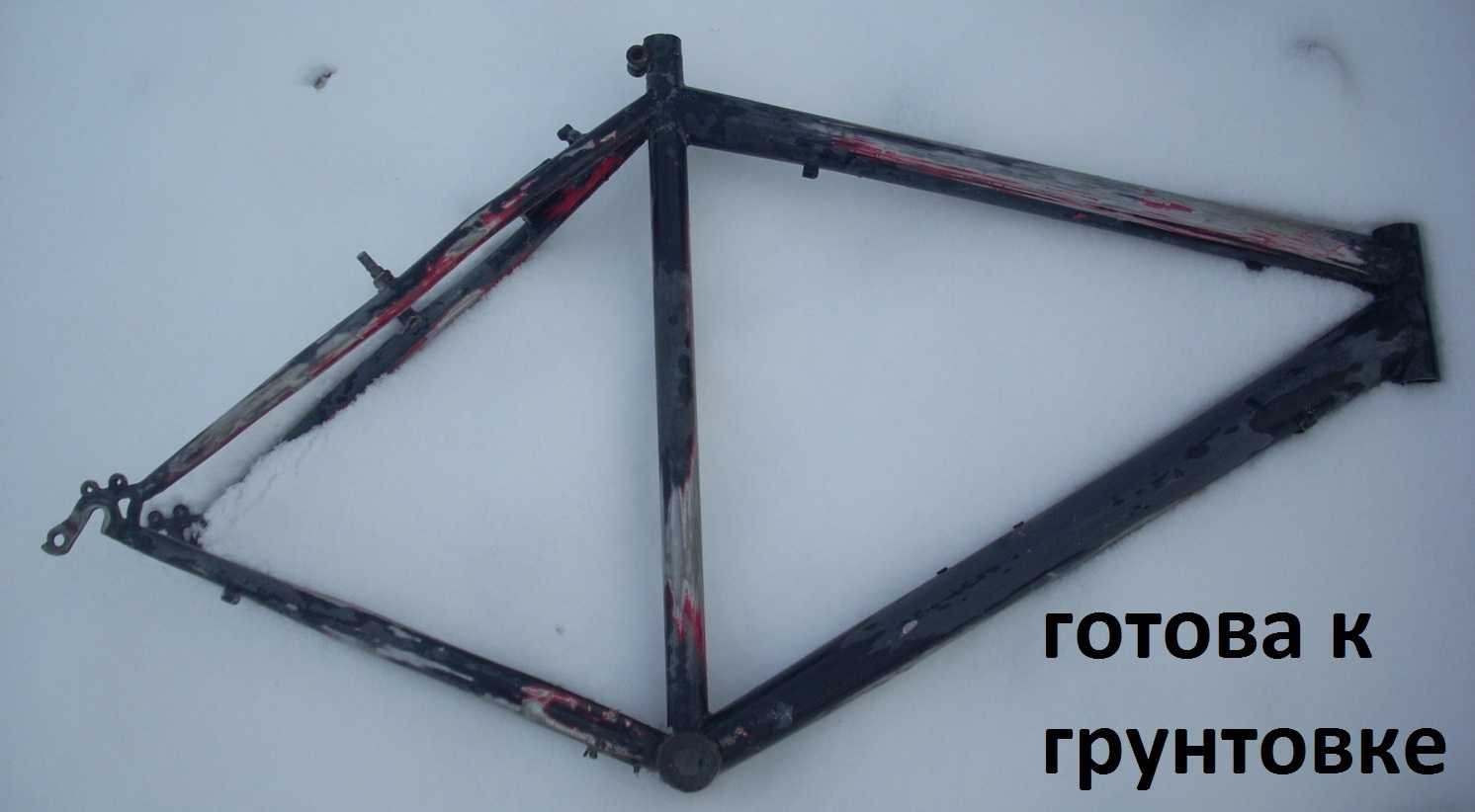 Рама велосипеда тщательно протирается и подвешивается или кладется на ровную поверхность. Следующим этапом будет зашкуривание