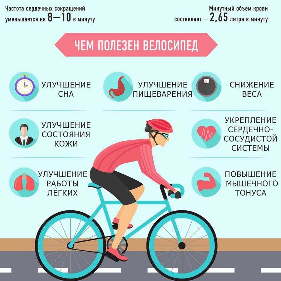 - Регулярная езда на велосипеде стимулирует работу сердца, улучшает систему кровообращения, снижает риск сердечно-сосудистых заболеваний и инсульта, понижает кровяное давление.