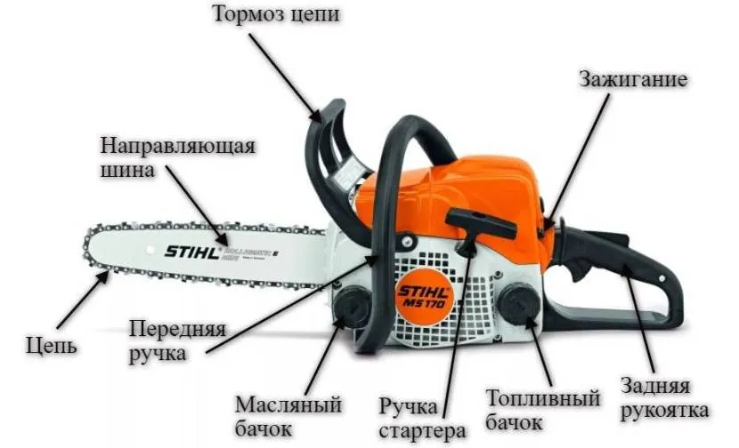 Стандартная модель бензопилы для резки древесины состоит из следующих основных элементов: