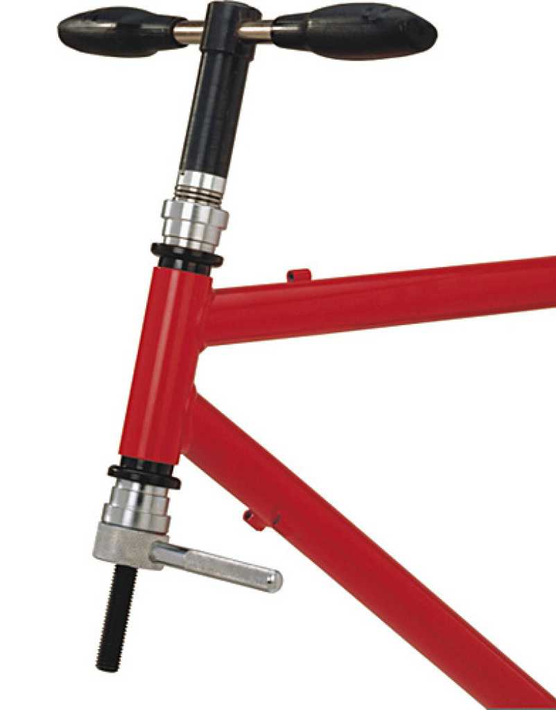 Рулевая колонка велосипеда чаще всего устанавливается в раму именно таким методом. Многие велосипедисты ошибочно полагают, что для проведения такой непростой процедуры достаточно воспользоваться молотком и «через деревяшку» буквально забить чашки рулевой в стакан рамы. Этот подход в корне неверный, так как при малейшей ошибке может стоит рамы (стакан может треснуть), или же повредить саму рулевую колонку, или же привести к неправильной установке и дальнейшему функционированию этого компонента. Для грамотной установки рулевой колонки велосипеда на своё законное место существует специальный инструмент под названием пресс рулевой колонки