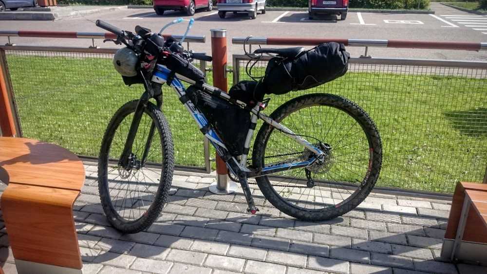 Для начала нужно распределить вес на велосипеде, чтобы сохранить развесовку: палатку пристегнуть жгутами-стяжками к рулю, спальник к подседельному штырю, вещи попробовать уместить в подрамную сумку.