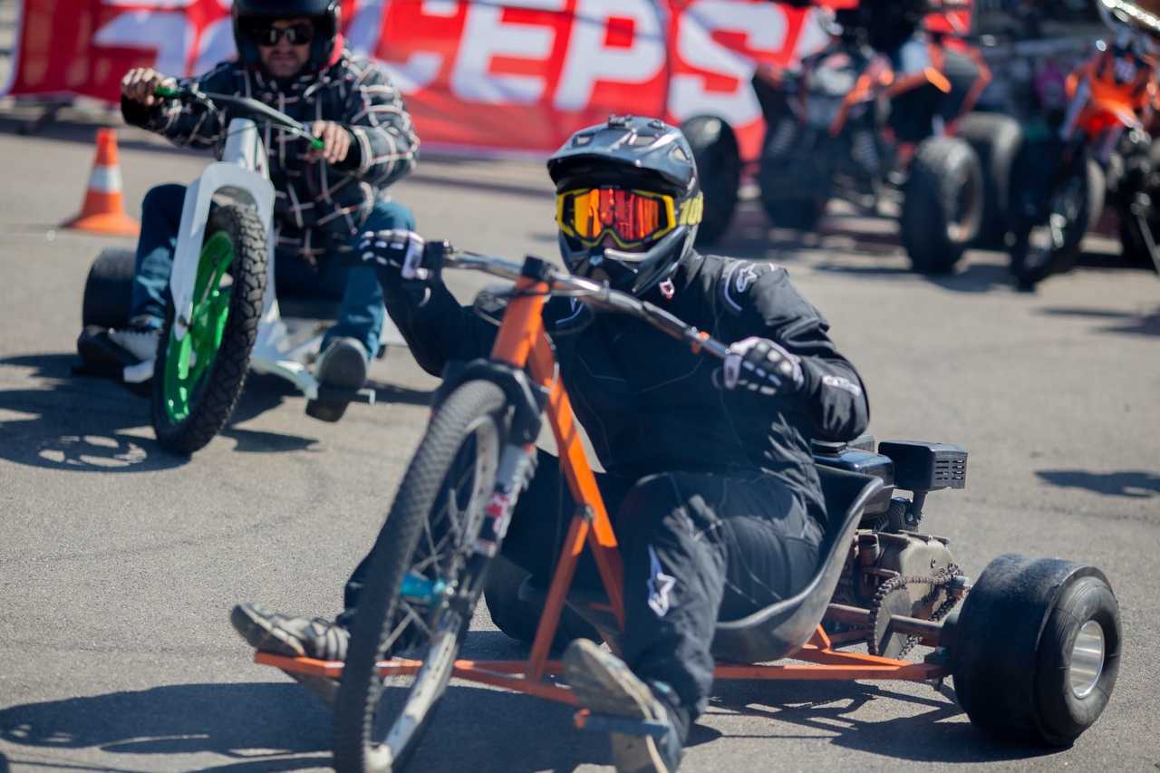 - Трицикл для дрифтинга Big Wheel Drift Trike. Эти модели пользуются успехом в дрифтинге. Это наверно самое лучшее изобретение в области дрифтинга. Вся конструкция выполнена из самых современных элементов. Рама выполнена из легкой легированной стали. Кроме этого спереди установлен двигатель с мощность 6,5 л.с. На задних колесах установлено покрытие из ПВХ, благодаря которому, обеспечивается идеальное скольжение во время заноса. Кроме этого на передней вилке имеется удобная подставка для ног. Однако есть один недостаток, это стоимость — она очень высокая. Но он действительно этого стоит, с такими качествами и функциями;