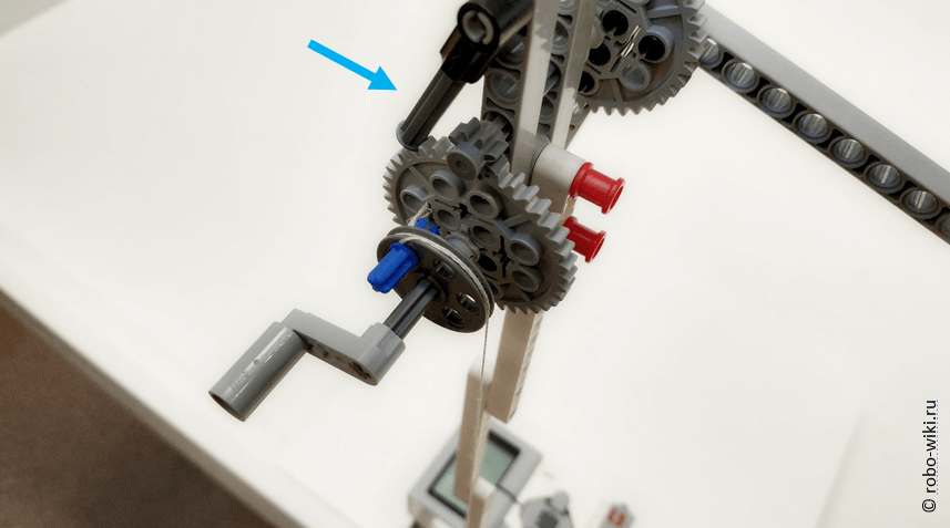 С помощью образовательных конструкторов можно собирать модели с храповым механизмом. В данном примере храповик собран из стандартного зубчатого колеса и собачки, состоящей из трех деталей (штифта, красного фиксатора и короткой оси). Зубчатое колесо приводится в движение ручкой