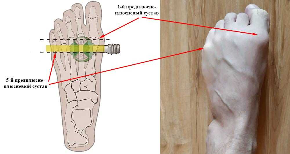 Ось педали должна проходить между 1-м и 5-м предплюсне-плюсневыми суставами. Чтобы понять где они находятся, можно сжать ногу: