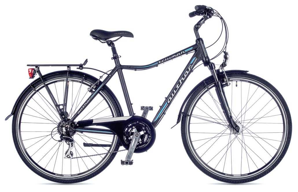 - Author Triumph − 24-скоростной байк с рамой на 17 или 19 дюймов, изготовленной из алюминиевого сплава, передней амортизационной вилкой с ходом 50 мм, 28-дюймовыми колесами с двойными ободами (из «крылатого металла») и безрезьбовой рулевой колонкой интегрированного типа. И спереди, и сзади этот двухколесный транспорт снабжен V-образными ободными тормозами.