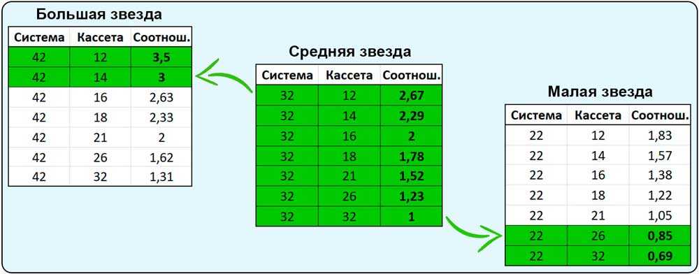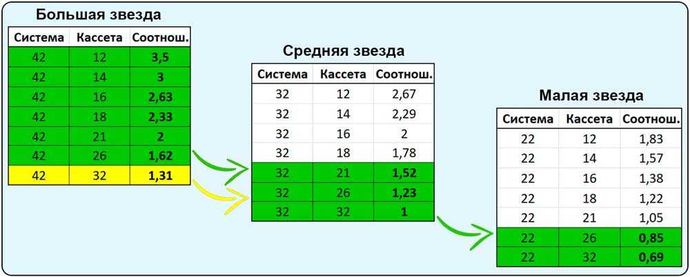 Зелёным цветом выделены «рабочие» передачи, т.е. средняя звезда основная и на ней мы используем их все. Передаточные числа от 1 до 2,67 позволяют ехать со скоростью от 0 до 30-35 км/ч. Например, на передаче 32/12=2,67 при размере колёс 27,5 дюйма и каденсе 100 скорость будет 34,6 км/ч. Если же нужно ехать быстрее, тогда переключаемся на большую звезду и используем ещё 2 более «быстрые» передачи. На каком-то крутом затяжном подъёме можно переключиться на маленькую звезду и использовать 2 более лёгкие передачи. Но в подавляющем большинстве случаев средней звезды будет достаточно.
