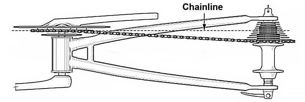 У средней звезды есть ещё одно преимущество: на ней не будет сильного перекоса цепи (если всё установлено правильно). Есть такое понятие как чейнлайн (ChainLine – линия цепи; показывает оптимальное положение цепи) и она приходится как раз на среднюю звезду системы. Т.е. в идеале средняя звезда находится чётко напротив середины кассеты (ну или близко к этому). Поэтому на ней можно смело использовать весь диапазон кассеты.