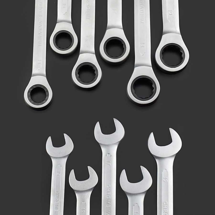 На фото гаечных ключей, идущих в наборах, видно, что комплектация обширная: инструменты разных размеров, насадки и множество аксессуаров, облегчающих работу с крепежными изделиями. Впрочем, для обычного человека подойдет и добротный универсальный агрегат.