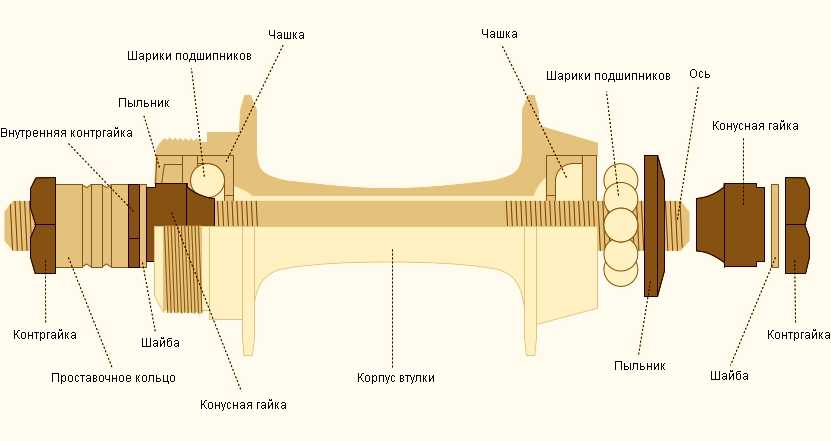 Как мы видим втулка с подшипниками типа «конус-чашка» состоит из: корпуса, оси, чашек, шариков, пыльников, конусных гаек, шайб, пыльников, контргаек (и барабана, если мы рассматриваем заднюю втулку).