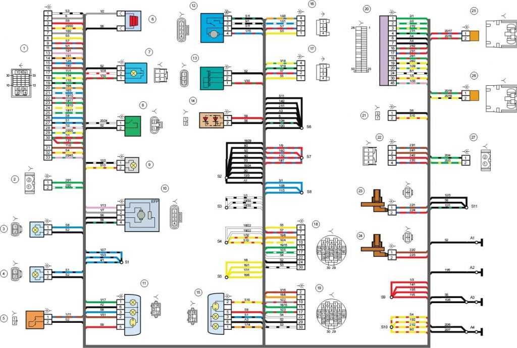 - 16-19 – клеммные колодки дверей для задней левой, задней правой, передней левой и передней правой дверей;