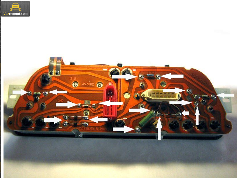 Неаккуратный монтаж приводит к выходу из строя элементов. На плате панели приборов детали крепятся при помощи простых заклепок, отсюда и отрицательный результат. На кузов постоянно действуют вибрации, поэтому монтаж просто «разваливается», в цепи появляются разрывы. Ремонт в этом случае представляет собой пропайку заклепок и тщательную зачистку контактов.