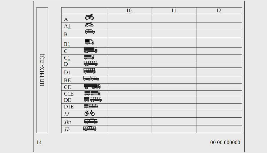На обратной стороне в левой части документа фиксируется штрих-код. В нём закодирована информация о гражданине. Всё остальное место занимает таблица с категориями. Дополнительно прописывается срок действия категории. Допустимо внесение дополнительной информации под таблицей. Обычно в этом месте фиксируется водительский стаж гражданина.