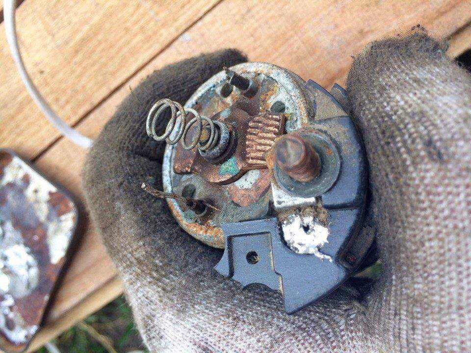 Подгорание контактной группы внутри устройства, из-за которого большой ток – не поступает на щетки электромотора, и он не крутится. Потеря проводимости из-за нагара, окисления «пятаков», сломанной, или съехавшей со своего места пластины — вторая по распространенности проблема реле стартера. При подобных неисправностях пусковое иногда щелкает, но не крутит шестерню.