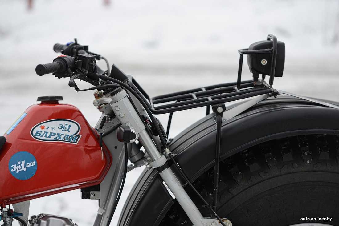 Заводится «Бархан» как обычный мотоцикл. Включаешь зажигание и жмешь кнопку стартера. На всякий случай есть и кикстартер, позволяющий запустить мотор ногой с помощью педали. На холодную движок неохотно держит обороты, благо есть подсос, решающий эту проблему. По управлению здесь все как у мотоциклов. Правая рукоятка — газ, рычажок под левую руку — сцепление, рычажок справа — передний тормоз, под правой ногой — задний тормоз.