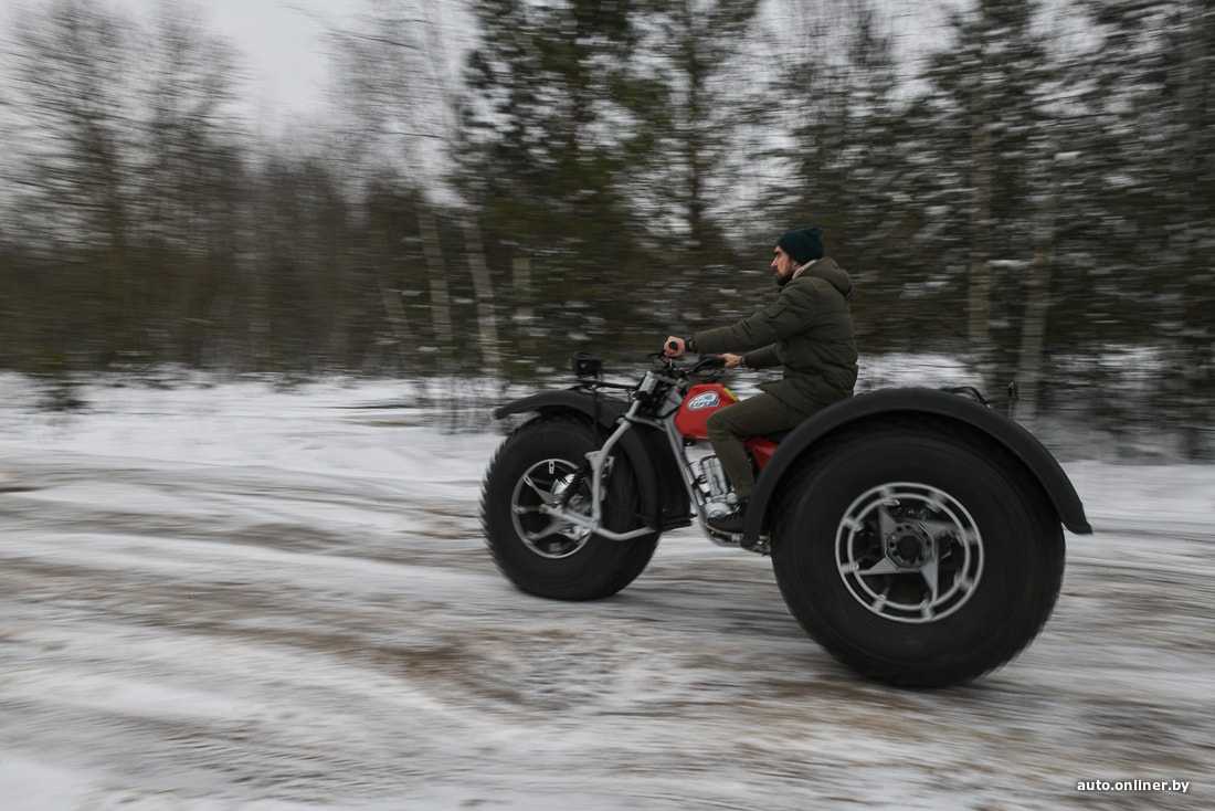 Шестнадцати сил вполне хватает, чтобы крутить гигантские колеса с тракторной тягой. Нет, с мотоциклом с коляской аппарат все-таки сравнить никак нельзя, рулится он по-другому. К его габаритам понемногу привыкаешь и начинаешь разгоняться. Благодаря заднему приводу он весело дрифтит на третьей передаче на льду. И на четвертой. И на пятой. На пятой мы его все-таки перевернули, словив нечто наподобие «хайсайда» — в одном из поворотов трайк накренился в наружную сторону, став на два колеса. Завис в воздухе, достигнув точки невозврата, и резко бахнулся на землю колесами вверх. Вот он, высокий центр тяжести!