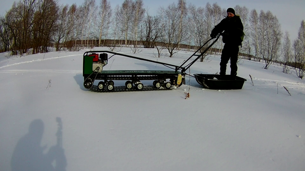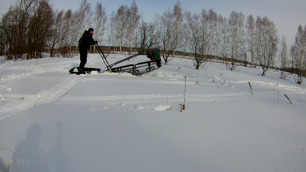 В общем проходимость длинного буксировщика именно в этих условиях можно сказать прекрасная. Разница с обычной гусеницей очевидна. К сожалению, мы поздно спохватились с его постройкой и обкаткой. Это стоило сделать раньше, когда снег был более рыхлый. Но одно можно сказать точно: проходимость буксировщика на длинной гусенице заметно выше, нежели на обычной.